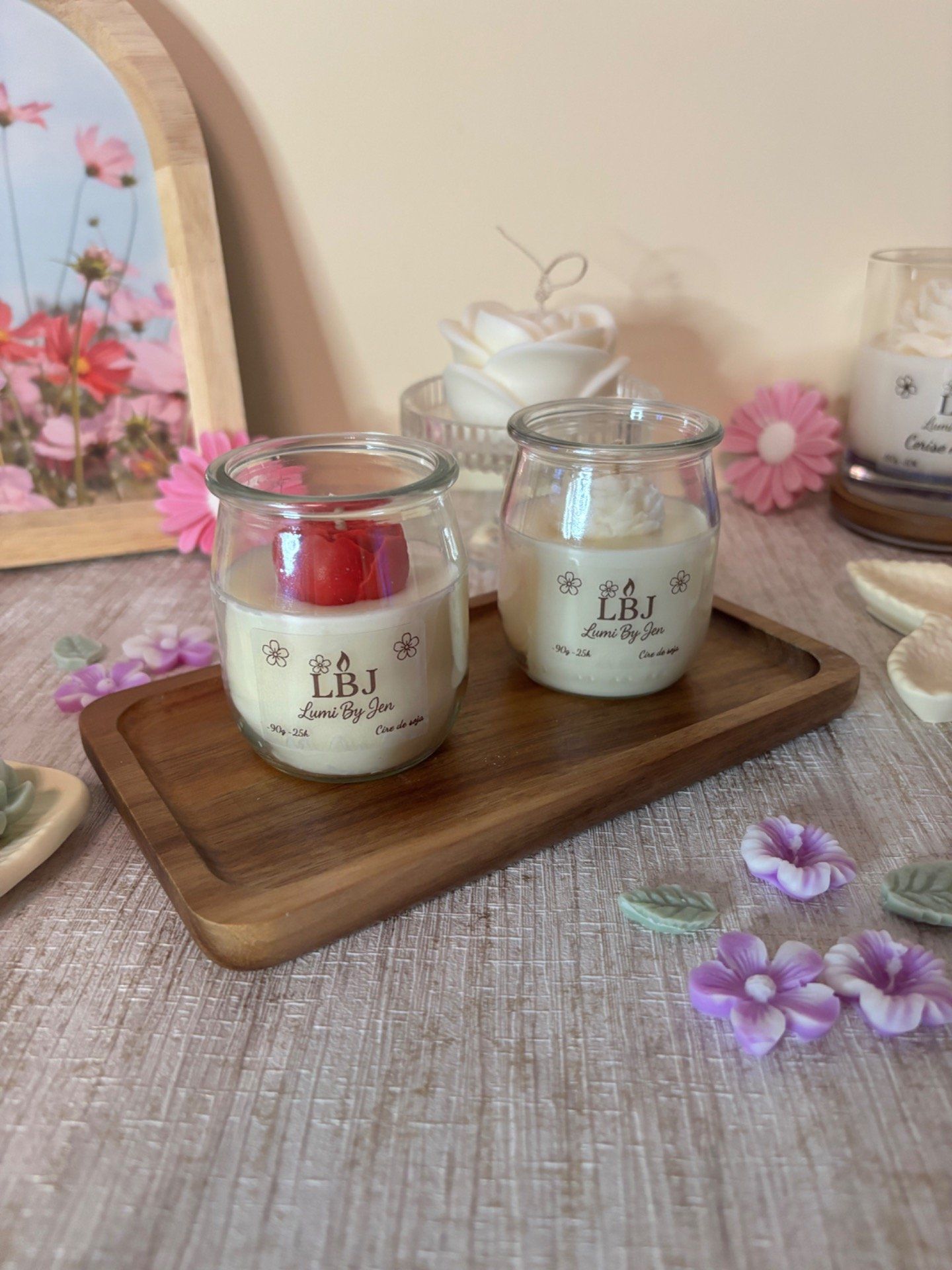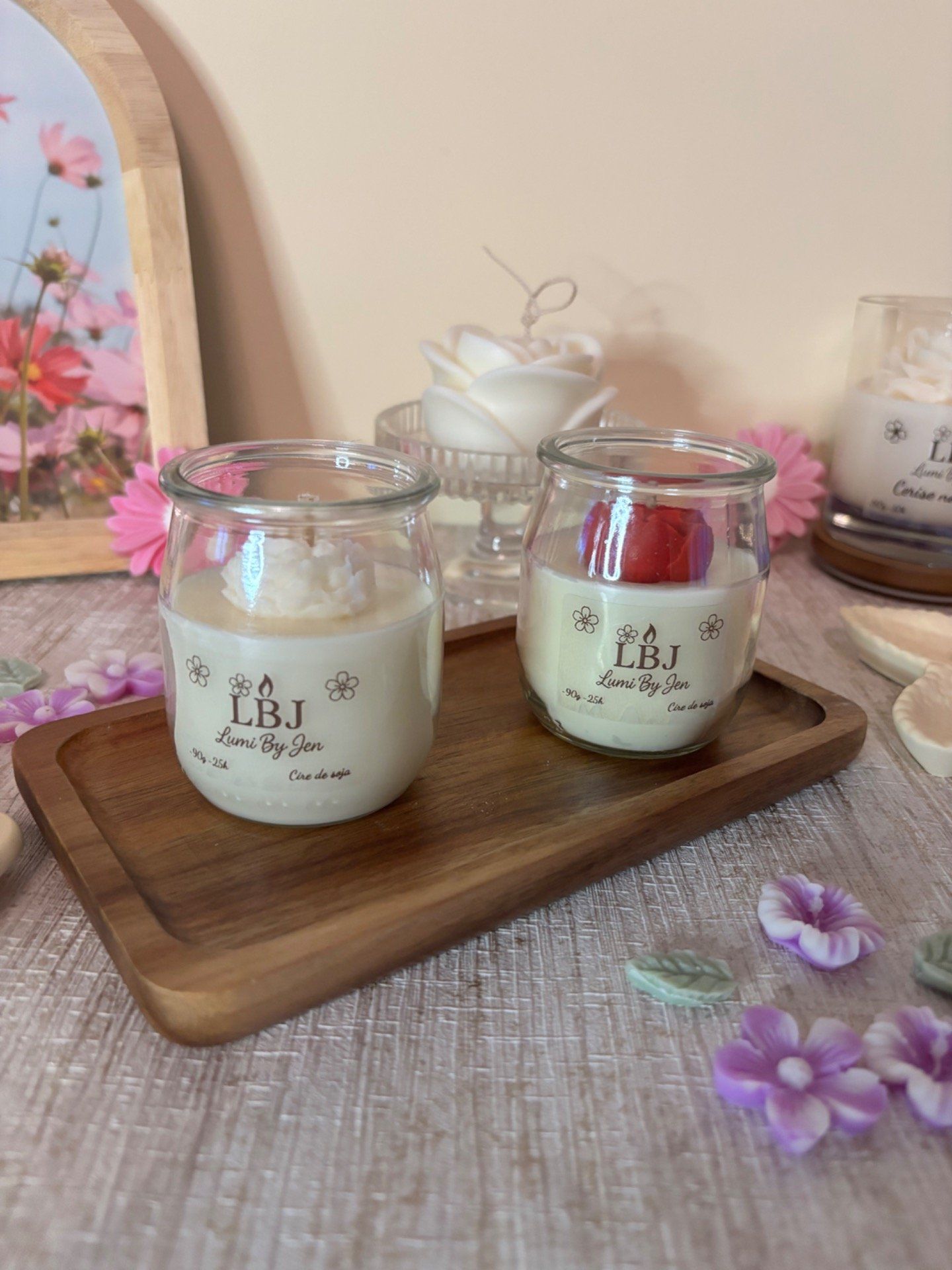 Bougie en cire de soja végétale et parfum de Grasse, coulée dans un contenant en verre recyclé (pot de yaourt type la laitière).