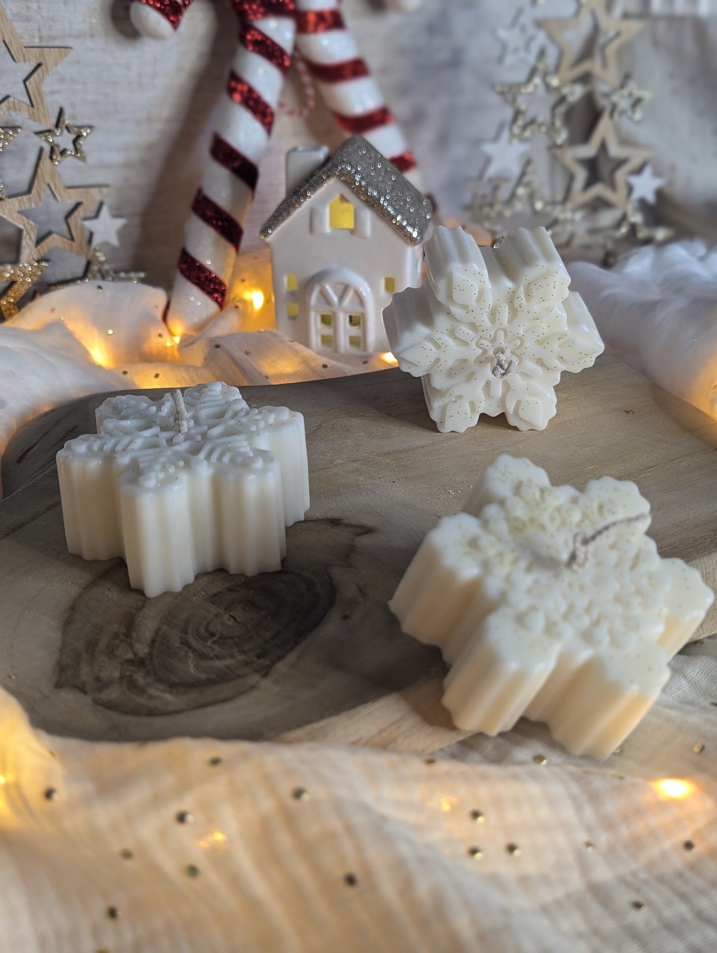 Lot de 3 bougies de 70 g : pièce (6,5 cm sur 3 cm) en cire de soja végétale, non parfumées en forme de flocon de neige, modèle aléatoire.
