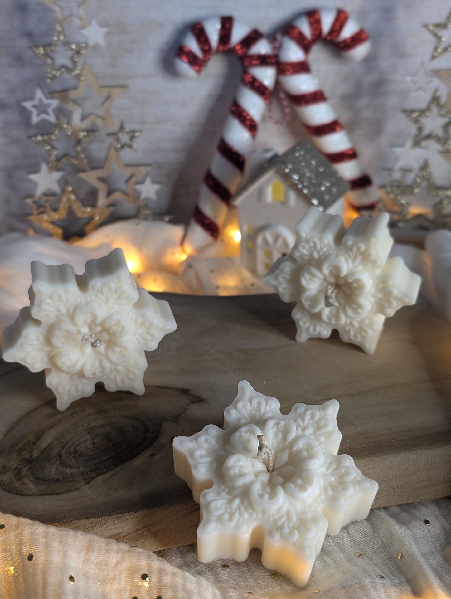Lot de 3 bougies de 60 g ( 7,5cm sur 2cm) en cire de soja végétale, non parfumées en forme de flocon de neige modèle N°2.